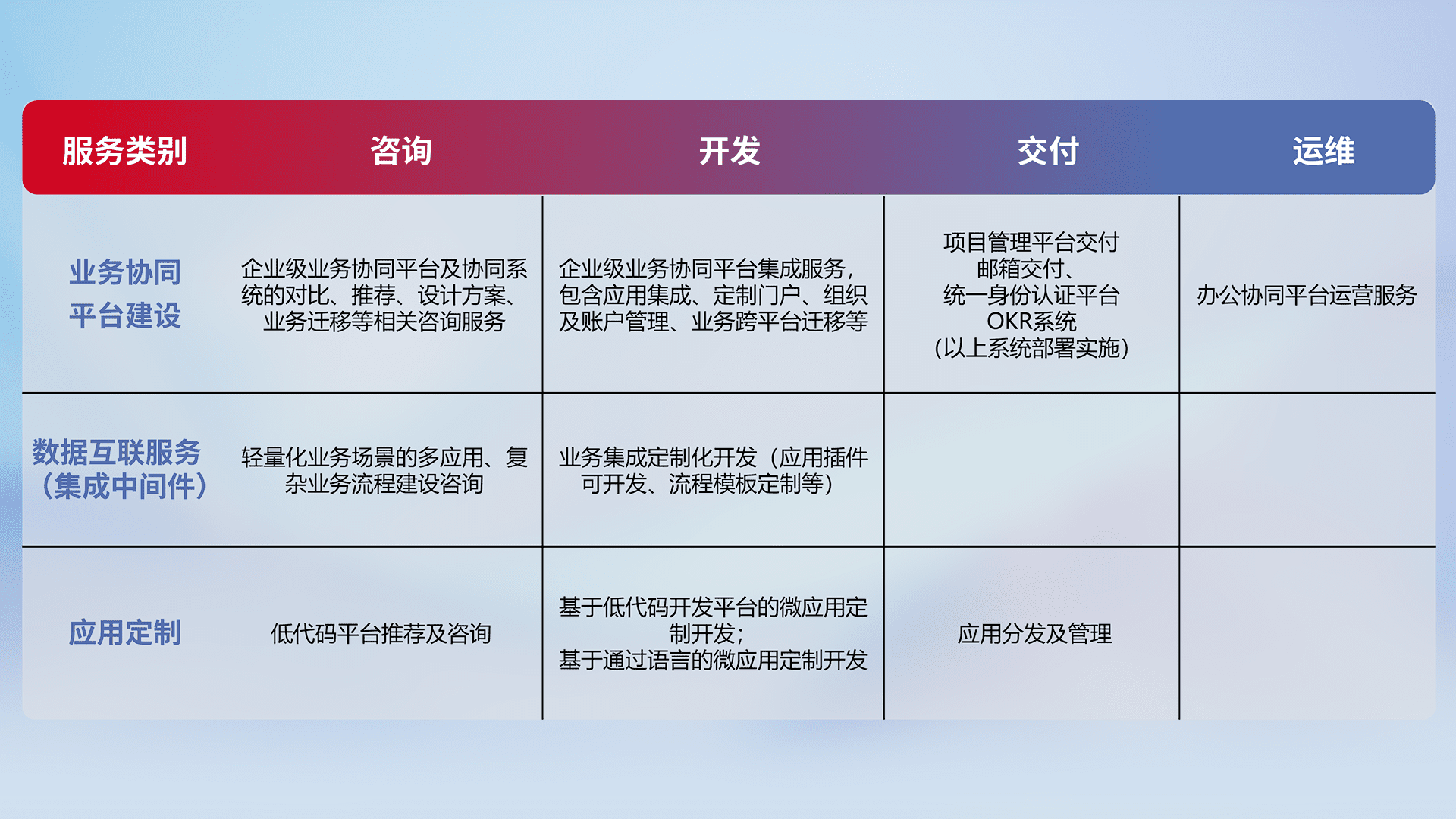 针对钉钉、、、企微、、、、IDaas等平台级产品提供产品的规划、、方案、、、交付、、、定制化开发等服务,,实现如统一协同办公、、智能客户服务、、混合会议管理、、智能数据查询、、、等业务场景,,,,实现数字化转型。。
